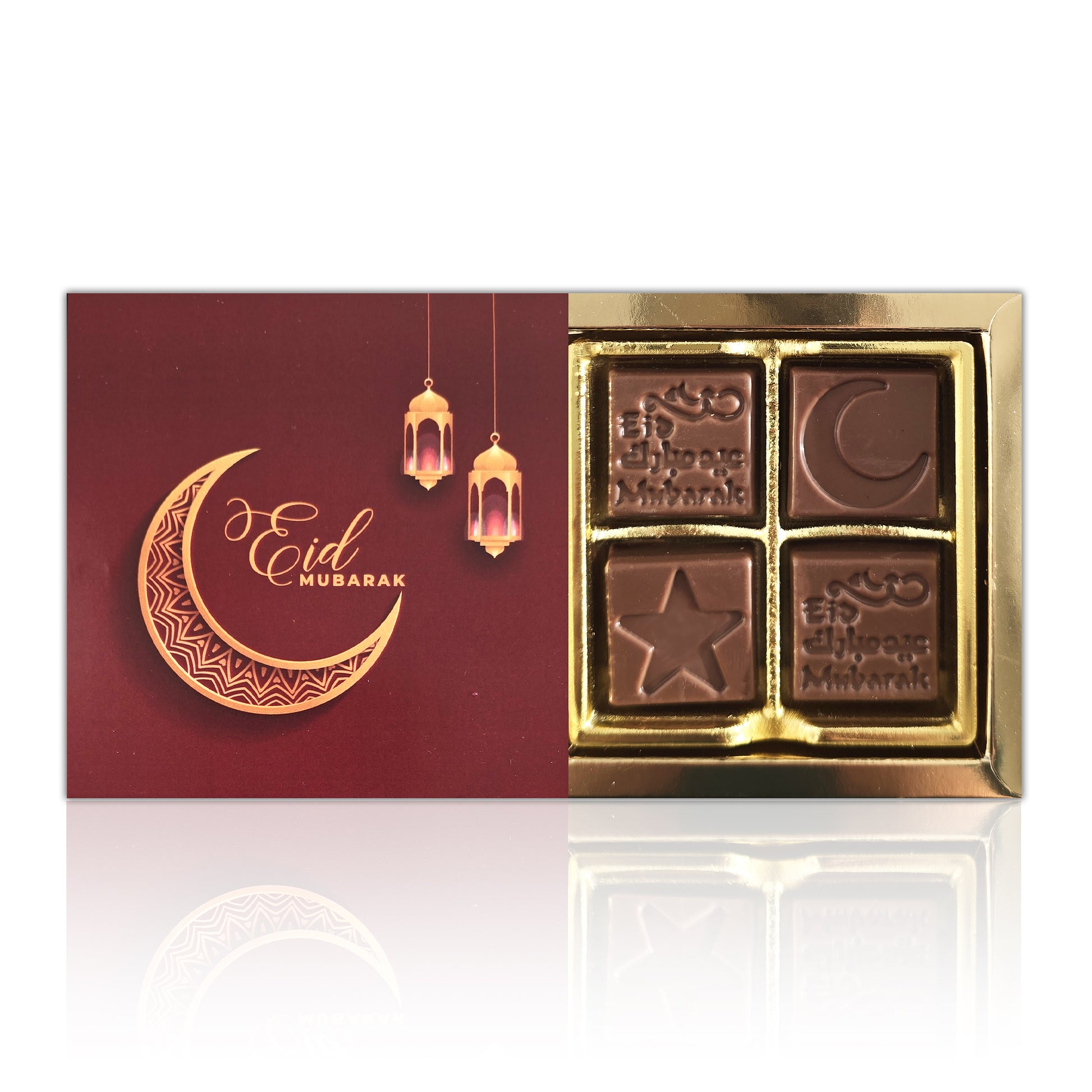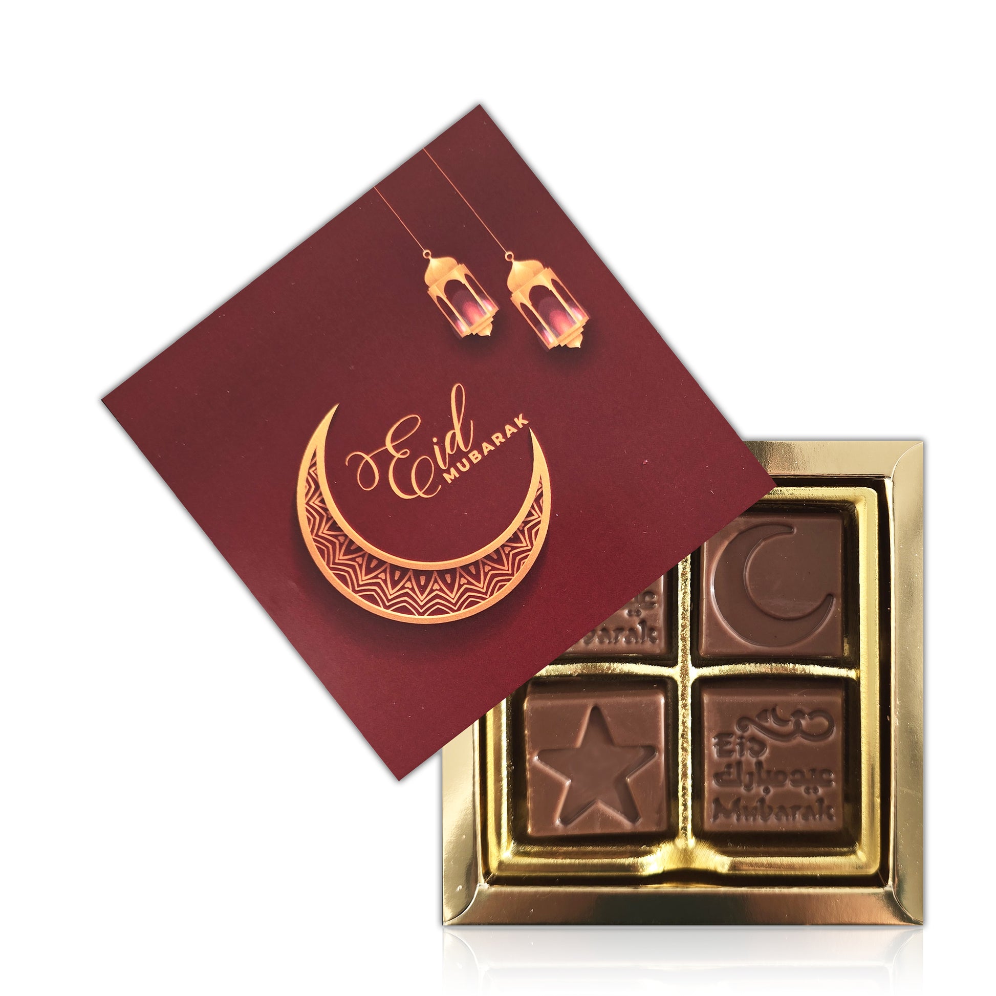 4 exquisite pieces of Eid themed chocolates, elegantly packaged in a luxurious sliding box adorned with a unique Eid design.